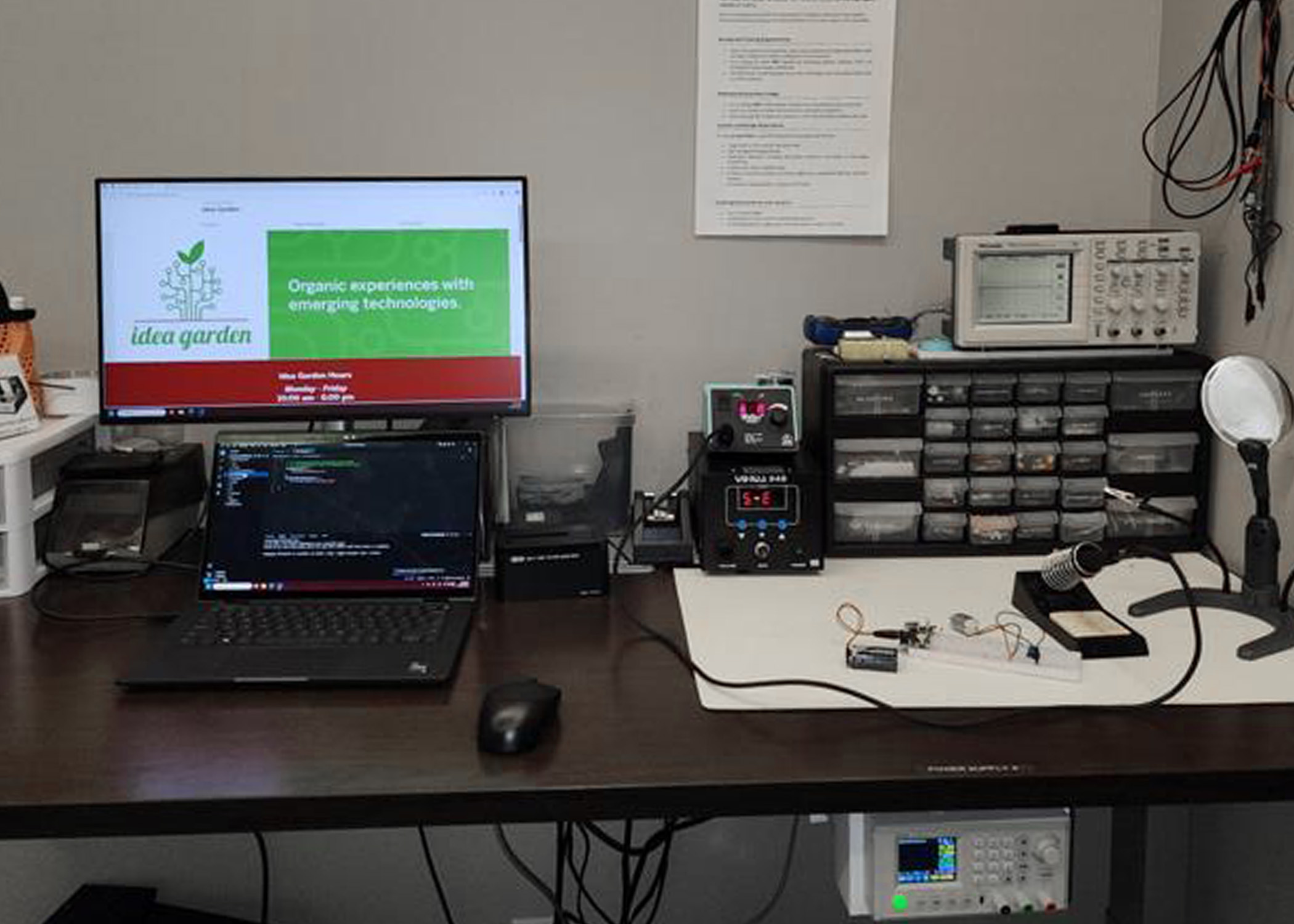 In addition, we have support for explorative learning, innovation, Internet of Things projects, and automated systems! We have Soldering and De-soldering, workbench Power Supply, Oscilloscope, Voltera circuit printer, and several hardware options to bring a project to life! Inquiry further at the Idea Garden!